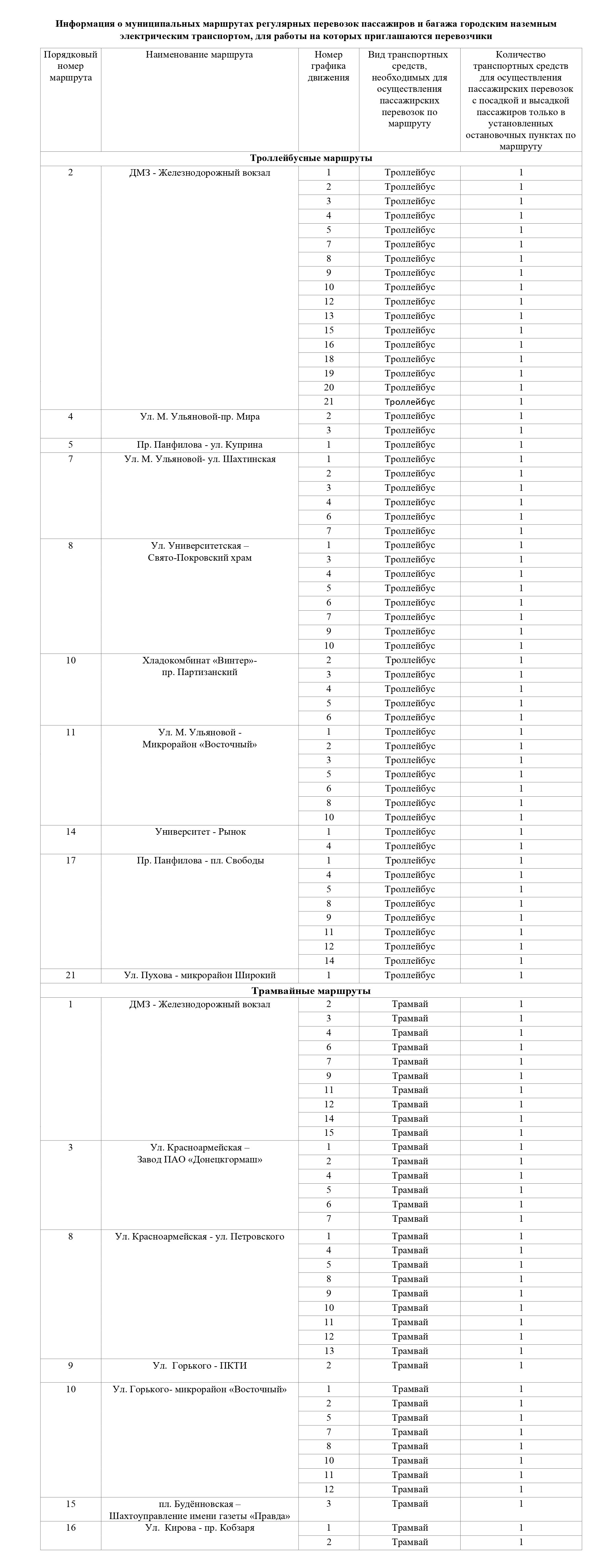 В связи с организацией работы муниципальных маршрутов регулярных перевозок пассажиров и багажа городским наземным электрическим транспортом на территории муниципального образования городской округ Донецк, Администрация муниципального образования городской округ Донецк ДНР приглашает субъектов хозяйственной деятельности в сфере городского наземного электрического транспорта для заключения временного договора на осуществление регулярных перевозок пассажиров и багажа городским наземным электрическим транспортом по муниципальным маршрутам регулярных перевозок на территории муниципального образования городской округ Донецк Донецкой Народной Республики.