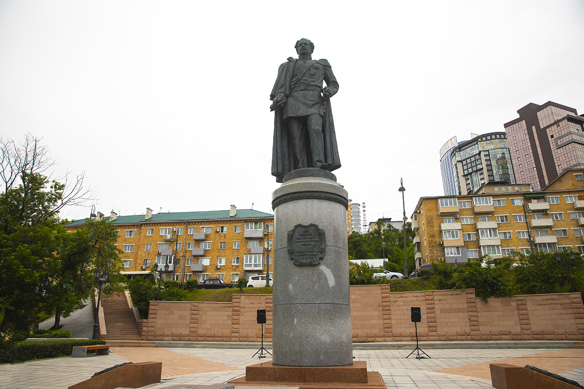 В 1859 году генерал-губернатор Восточной Сибири граф Н.Н. Муравьев-Амурский, посетивший на корвете "Америка" залив Петра Великого, обратил внимание на удобную гавань, как будто специально предназначенную природой для создания порта, и 2 июля 1860 года по его указанию был основан город Владивосток. В 2012 году в одноименном сквере был открыт памятник Муравьеву-Амурскому.